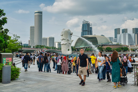 Singapore- 28 Jan, 2020: Visitors at Merlion Park in Singapore city center. Merlion is a famous landmark in Singapore and popular for tourists.