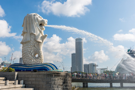 Singapore, Singapore: 6 January, 2017: Iconic Singapore Merlion with the city skyline in the background