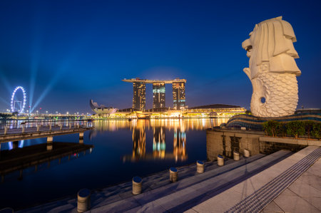 The Merlion, Iconic symbol of Singapore, featuring a mythical creature with a lion’s head and fish body, representing strength and heritage, viewing from the Marina Bay