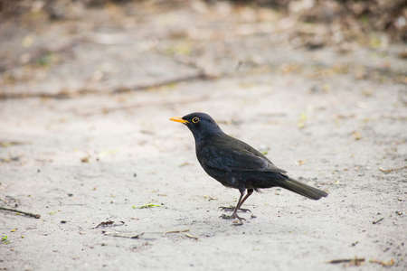 Blackbird with a yellow beak on the ground. Birds