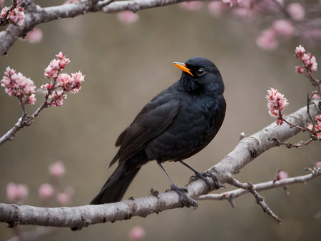 Glossy blackbird perched on white picket fence surrounded by pink flowers. Concept of spring nature, garden wildlife, birdwatching, serene beauty, cute bird.