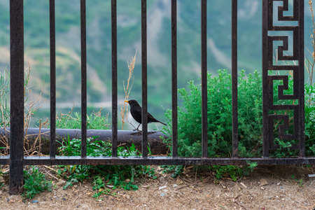blackbird behind the iron park fence during the rain
