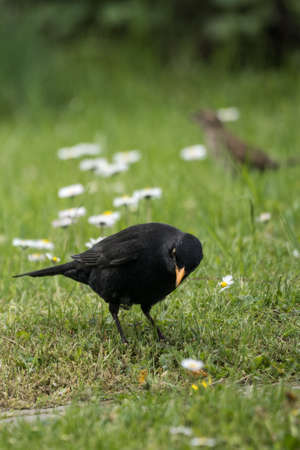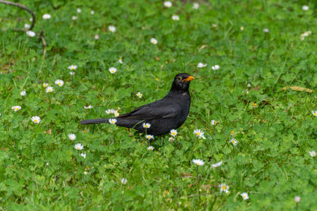 A blackbird stands in the clover among small daisies. The black bird with its yellow beak stands out sharply against the green background.
