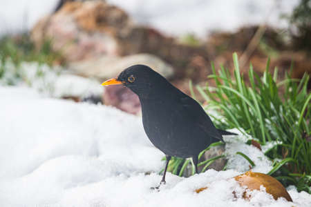 Male Blackbird feeding in the snow.
