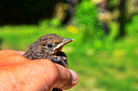 Baby black drizzle in his hand. A young Blackbird (Turdus merula) after leaving the nest.