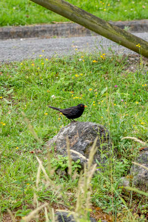 Songbird blackbird on a stone in the park among the green grass. Bird in the wild with black feather and yellow beak