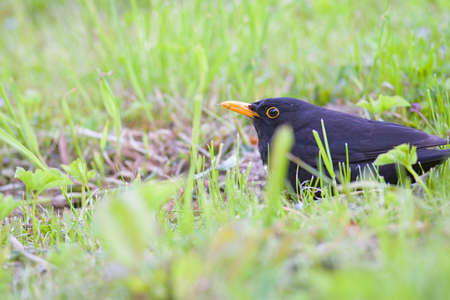 Male or Common blackbird. Turdus merula, Sitting in grass, side view.