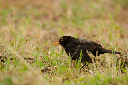 Male blackbird on the ground in the grass.