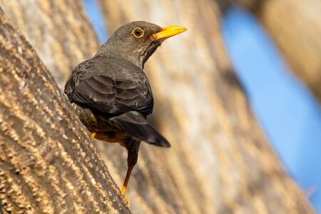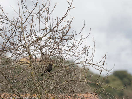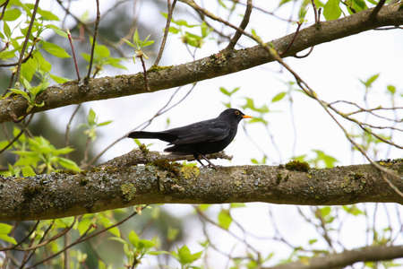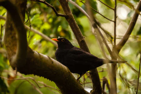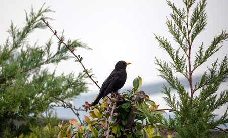 Î’lackbird on tree branch. Male songbird turdus merula with orange beak between the trees, cloudy sky background.