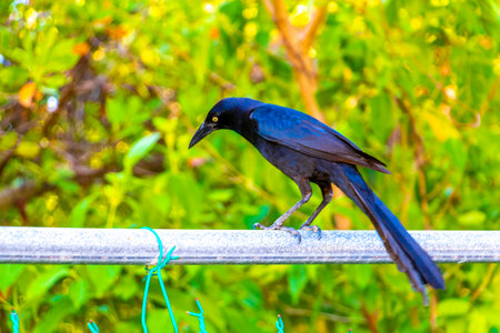 Great-tailed Grackle bird sits on fence plant tree in the tropical nature in Playa del Carmen Quintana Roo Mexico.
