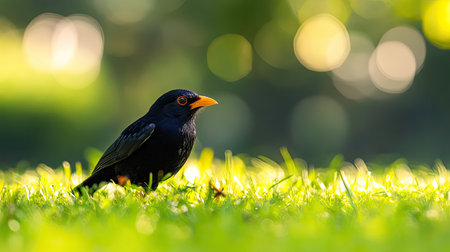 A striking black bird with a bright orange beak stands gracefully on fresh green grass, illuminated by soft golden light, capturing the essence of nature's tranquility.