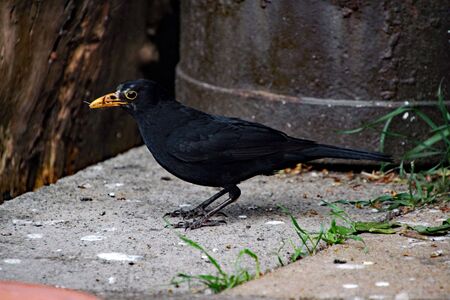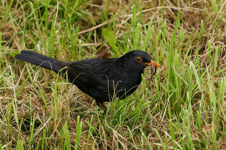 Male blackbird (Turdus merula) with a beak full of grubs and worms. Garden bird foraging for food as meal for young.