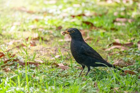 A male blackbird collects worms on a green lawn. Common blackbird, Turdus merula. Bird with beak full of worms. Close-up of foraging parent animal collecting food.