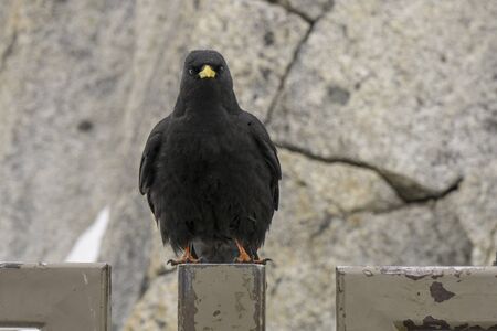 Alpine chough with its characteristic orange beak is perching on a rock in a high-altitude environment