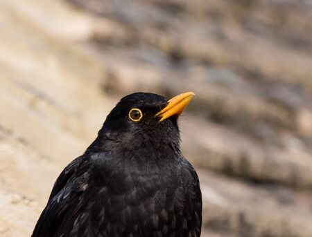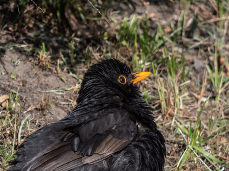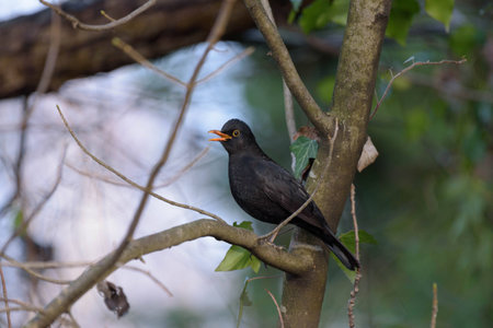 Common blackbird Turdus merula in the wild. Close up songbird.
