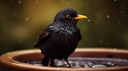 blackbird perched on a branch, braving the rain. forest birds in the background. nature picture captured in the style of tilt-shift lenses. detailed character design with dark bronze and yellow hues. realistic rendering of elegant and emotive faces. a beautiful aurorapunk scene with selective focus. ai generated