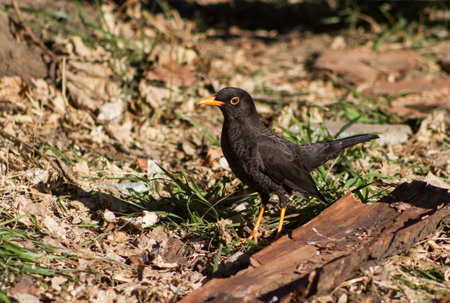 A blackbird, here a male, is looking for worms in the grass and under the leaves.