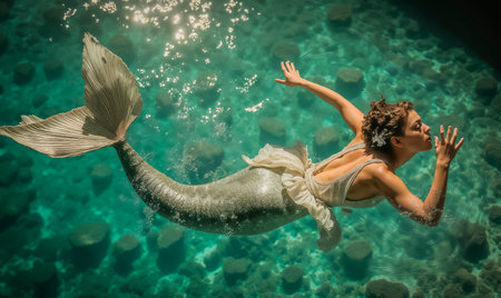 Beautiful young woman with mermaid tail swims and dives under sunny deep water, fantastic fish in water, fairy tale character half man half fish, generative AI.