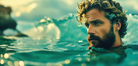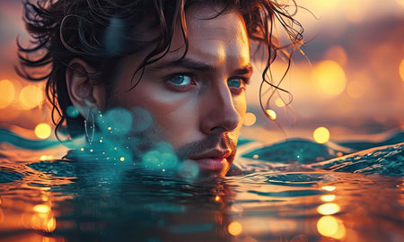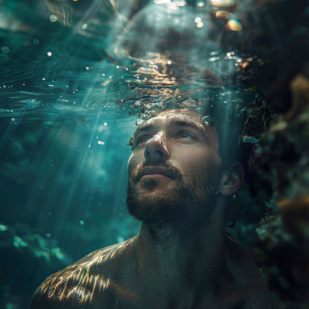 Young caucasian man submerged underwater with serene expression, surrounded by shimmering light and bubbles.