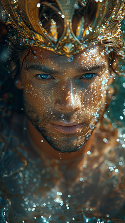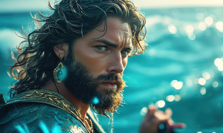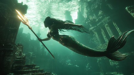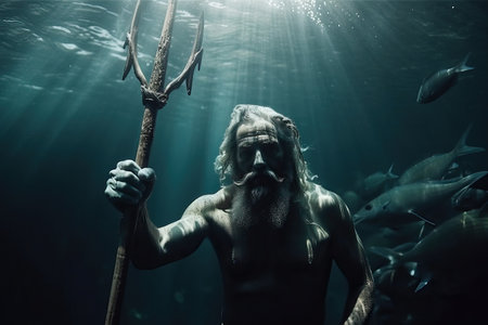 Neptune is the god of the sea under water, Poseidon is the mythical god of water, the trident is in the hands of the mythical god of water, generative AI.