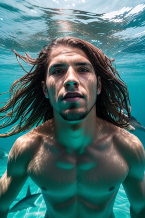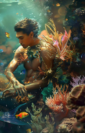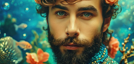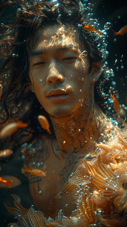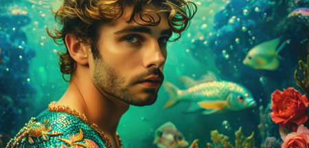 Fantasy portrait of a young man in the underwater world. The mermaid looks at the fish.