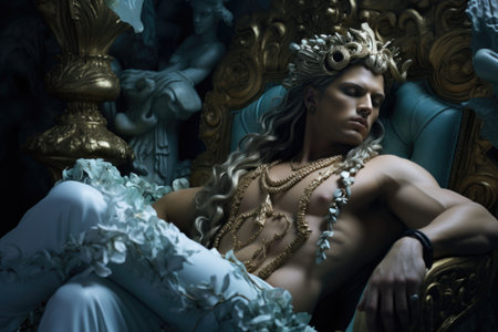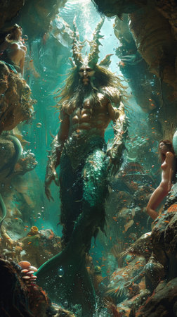 Demon in an underwater cave hoarding treasures from sunken ships surrounded by mermaids