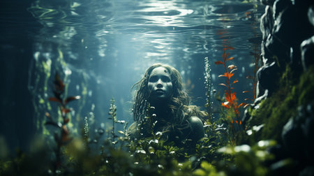 An enchanting underwater scene that showcases a peaceful figure surrounded by lively and colorful marine life. Generative AI