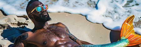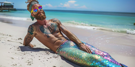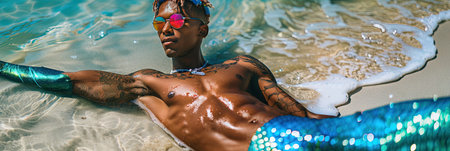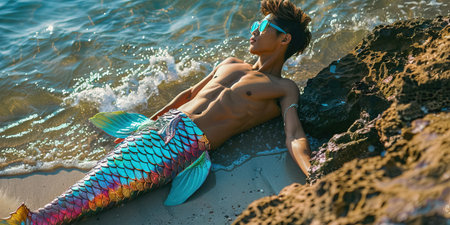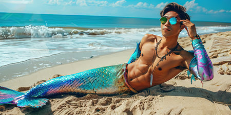 Handsome young man in sunglasses and swimsuit posing with blue mermaid tail on the beach