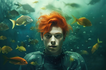 A fantastic male portrait of an attractive red-haired guy underwater. Close-up of a young handsome man with fishes and water bubbles around him. Generated by AI.