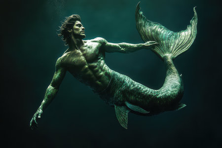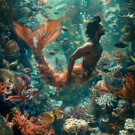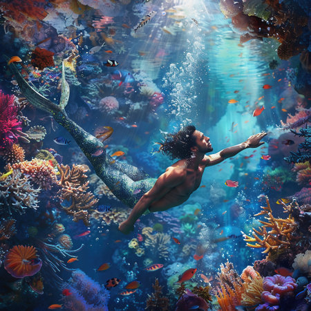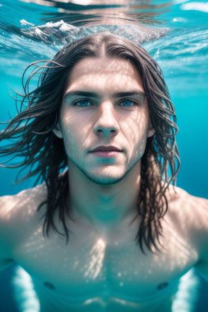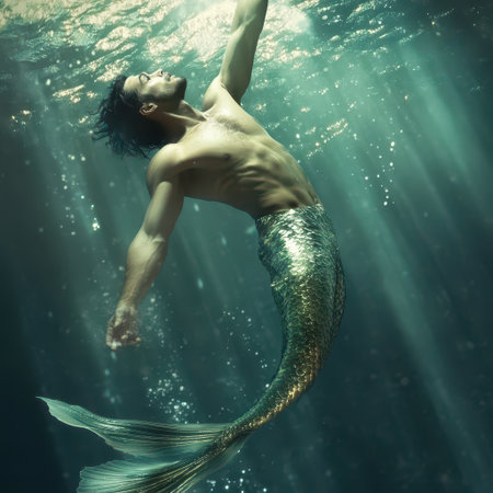 A serene underwater view features a male mermaid gliding effortlessly with flowing hair and a shimmering tail in crystal clear water.
