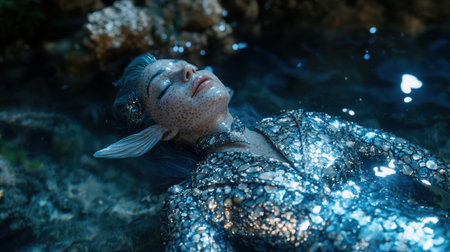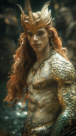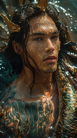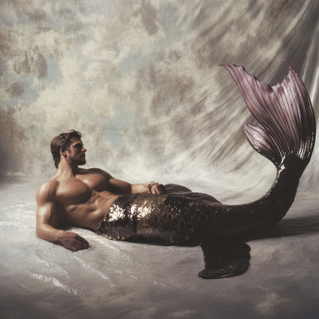 A male model lounges gracefully as a merman on a rocky surface showcasing intricate scales and a captivating tail against a moody backdrop.