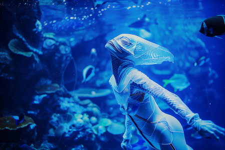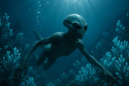 Underwater view of an alien swimming in the ocean. Underwater world.