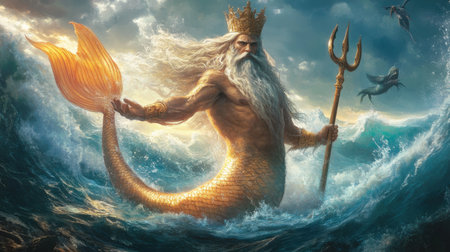 A majestic depiction of Poseidon, God of the Sea, wielding his trident amidst powerful ocean waves. His golden tail and regal crown highlight his power.