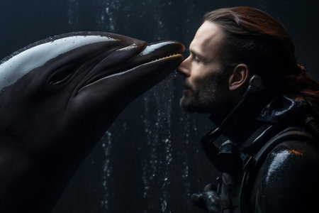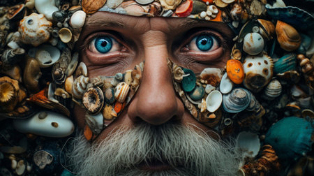 Quirky portrait of a senior man wearing a sparkling blue dolphin costume, embodying eccentricity and playful spirit against a vibrant blue backdrop