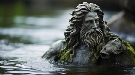 Stone statue representing human figure meditating, immersed in river water, conveying concepts of meditation, nature, and philosophy