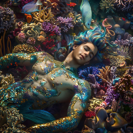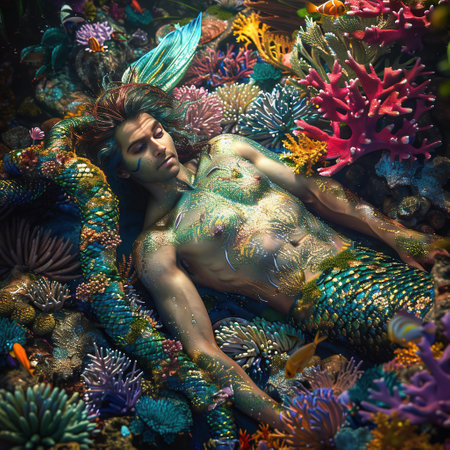 A serene mermaid rests among vibrant coral reefs as sunlight streams through the clear ocean waters Use for fantasy art and nautical themed designs.