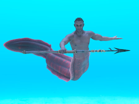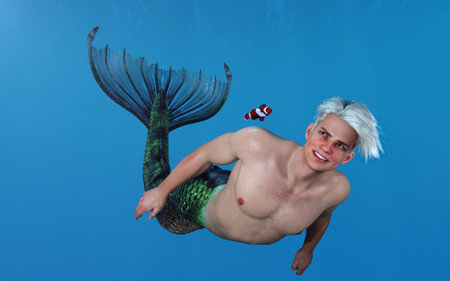 3D render: a merman creature is swimming under the sea with the clownfish nearby