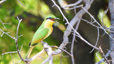 Colorful little green bee-eater bird perch on a bare tree branch, bird chirping loudly, Cute bee-eater Spotted in Yala national park, Sri Lanka.