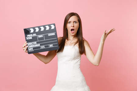 Irritated bride woman in white wedding dress swearing spreading hand holding classic black film making clapperboard isolated on pastel pink background. Wedding to do list. Organization of celebration
