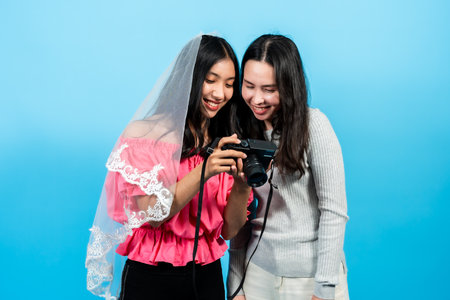 beautiful asian lgbtq couple taking photo for girlfriend after being proposed When you're done taking pictures. Both women looked at the pictures they had taken. studio background