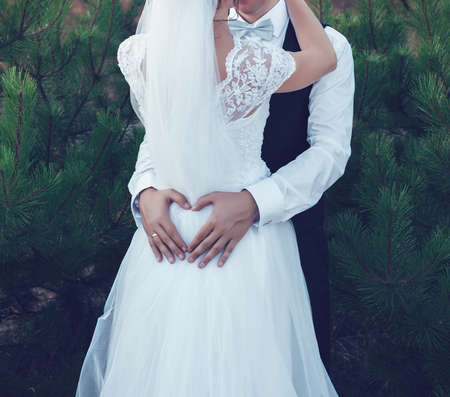 Bride and groom in a park kissing.couple newlyweds bride and groom at a wedding in nature green forest are kissing photo portrait.Wedding Couple
