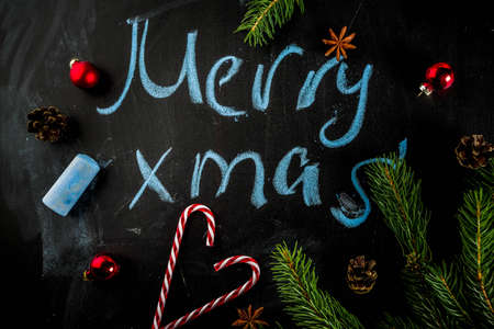 Christmas or New Year dark background, Xmas black board framed with season decorations, space for a text