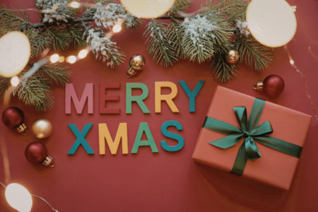 A festive Christmas scene featuring a red gift box with a green ribbon, surrounded by Christmas tree branches, ornaments, and fairy lights on a red background, with the words 'Merry Xmas' in colorful letters.