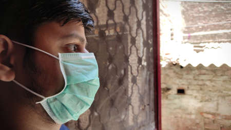 Man wearing mask looking outside open door ,Home quarantine, feeling bored,Covid 19, corona virus pandemic.