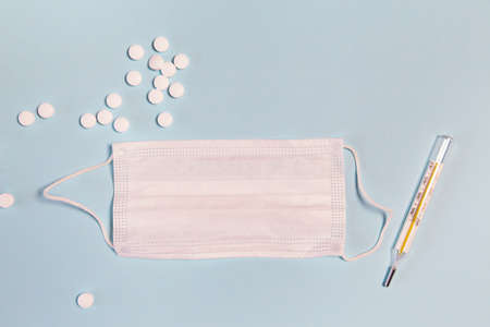 Medical masks, pills and thermometer on pastel blue background. Coronavirus protection concept