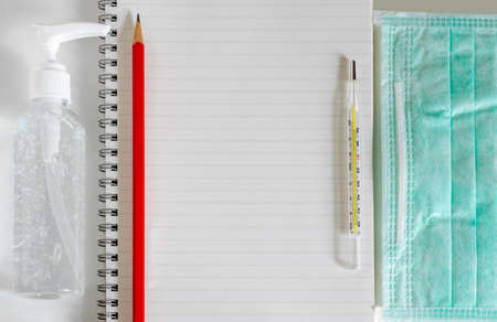 Workspace with notebook, pencil, medical mercury-in-glass thermometer, hand alcohol gel and medical face mask. Top view on white table. Healthcare concept for work at home during quarantine.