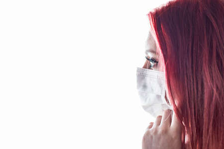 Side view closeup portrait of woman with medical mask. There is enough space for your text in the photo.