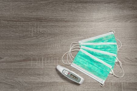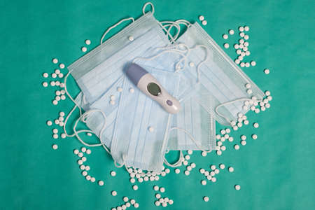 Background from medical pills and surgical masks. Medical background. Electronic medical thermometer.