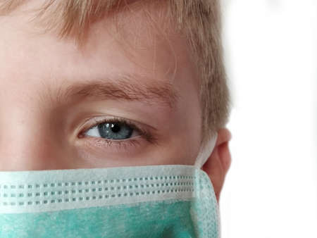 Masked child. The face of a 7-year-old boy in a protective surgical mask close-up. Schoolboy with blond hair and blue-gray eyes on white background