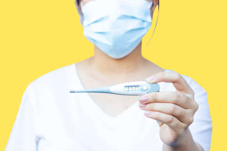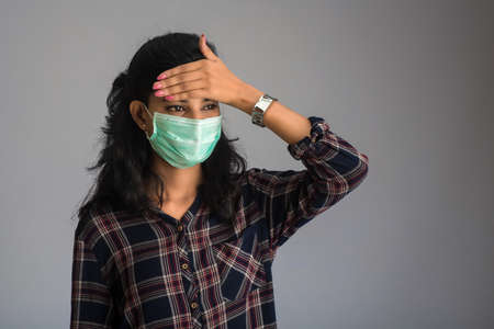 Beautiful woman having a fever wearing a medical mask feeling sick and ill.